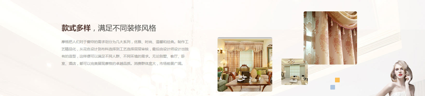 摩格把人們對于窗簾的需求劃分為幾大系列,優(yōu)雅、時尚、溫馨和經(jīng)典。制作工藝精品化,從花色設(shè)計到布料選擇到工藝選擇層層審核,最后由設(shè)計師設(shè)計出獨有的造型,這樣便可以滿足不同人群、不同環(huán)境的需求。無論別墅、客廳、臥室、酒店,都可以完美展現(xiàn)摩格的卓越品質(zhì)。消費群體…