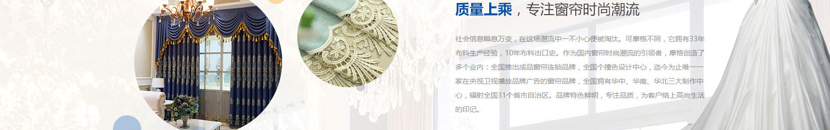取源于中華悠久紡織文化的摩格(MOONGOOL)品牌,始終堅持“健康、時尚、精致”的產(chǎn)品觀,引領(lǐng)軟裝布藝行業(yè)進入高品質(zhì)生活。產(chǎn)品設(shè)計風格融入歐式低調(diào)奢華元素及國際流行時尚趨勢,先后開發(fā)了古典巴洛克、簡約洛可可、經(jīng)典中式(新中式)、時尚地中海、浪漫田園、唯美美式、原木風、奶油風、現(xiàn)代簡約風九大風格系列產(chǎn)品,擁有各種花型、工藝、材料面料達1500余種。其中窗簾產(chǎn)品作為摩格核心產(chǎn)品頗受消費者青睞。采用高精密、棉麻、雪尼爾等上千種布料的摩格窗簾用高端的新興工藝制作,絨面柔軟,織物華麗,九大截然不同的風格同時搭配種類繁多的布類花型和不同的制造工藝,顏色或艷麗或素雅或大氣,簡約而不簡單。無論哪一款窗簾,都在注解不一樣的故事,也詮釋著自己的絕佳格調(diào)。正因為如此,個性獨特和創(chuàng)新思維賦予摩格更多的市場商機。